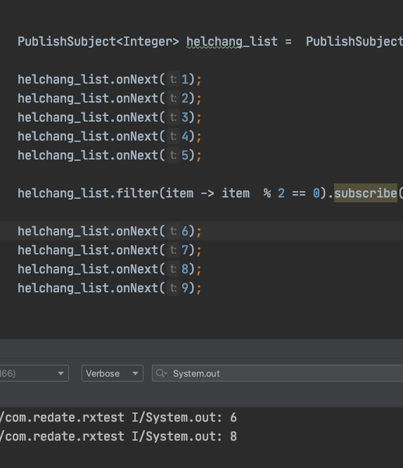 여기서 PublishSubject는 구독 시점 이후의 데이터만 옵서버에 전달하다는 특징이 있어서 6과 8만 출력이 되었지만