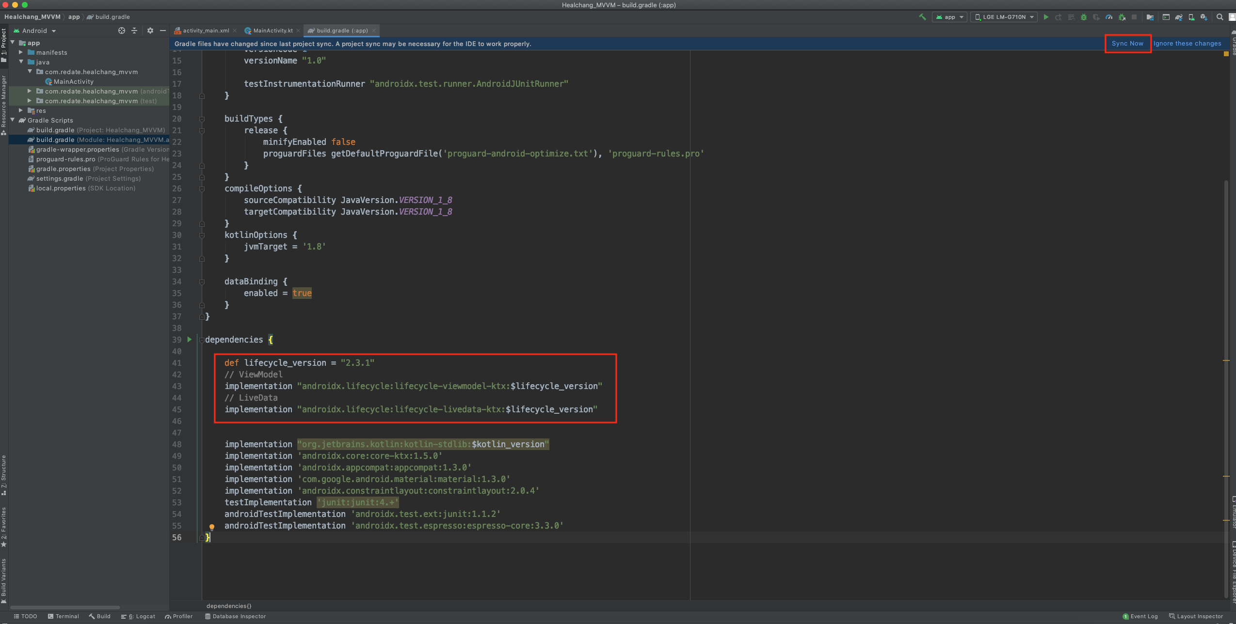 2. 다음으로 안드로이드 dependencies 에 ViewModel, LiveData 라이브러리를 implementation 합니다