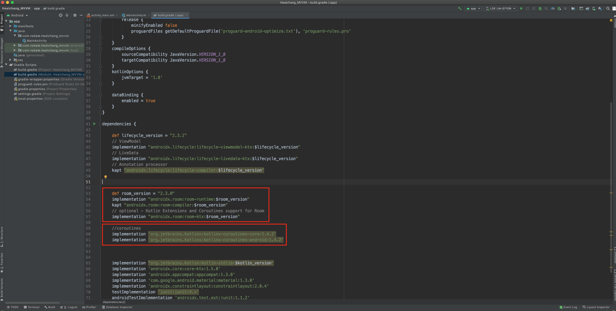 5. 다음으로 안드로이드 dependencies에 Rooom 라이브러리와 Coroutinnes 라이브러리를 추가해줍니다.