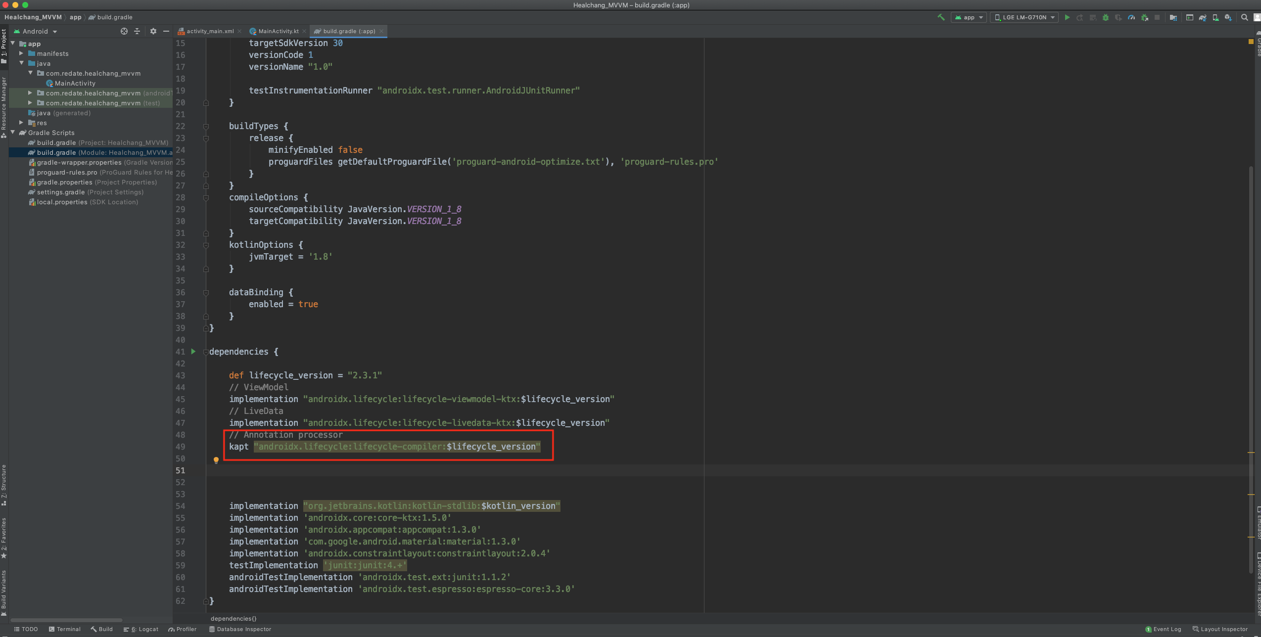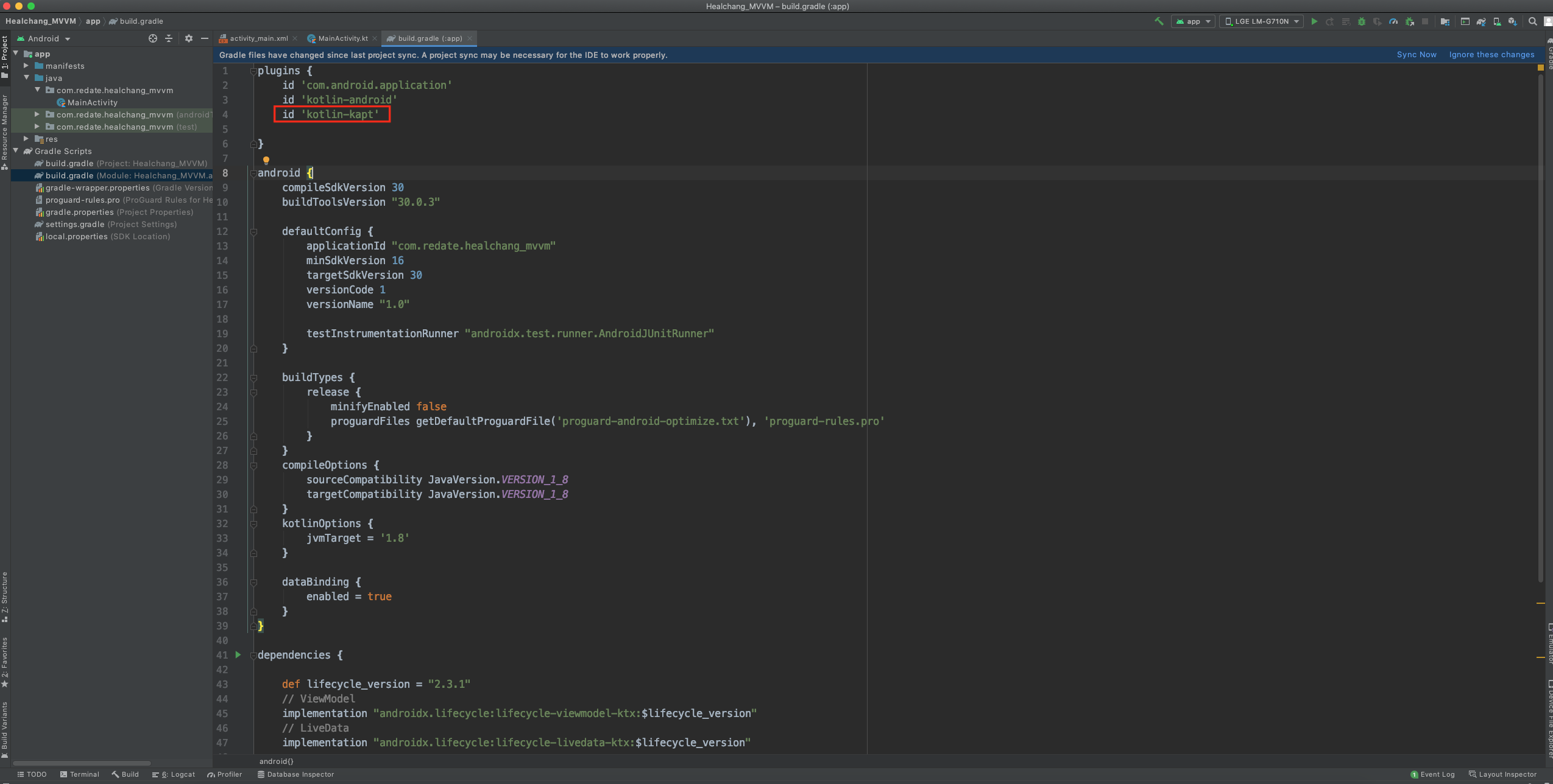 2. 다음으로 안드로이드 Gradle에 데이터바인딩 라이브러리를 추가합니다