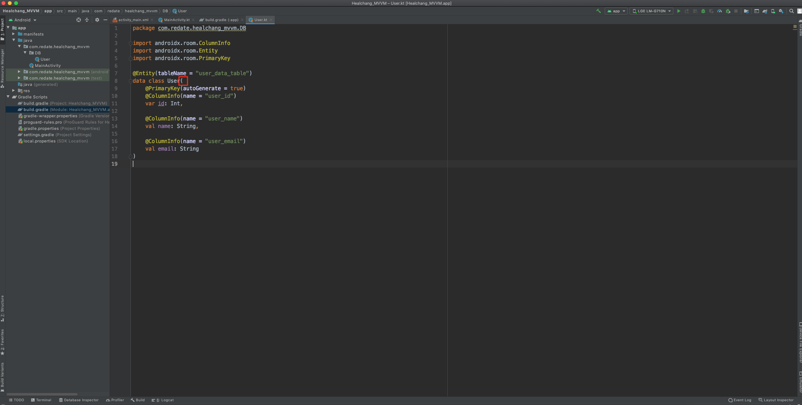 2. 안드로이드 스튜디오에서 DB 패키지를 하나 만들고 패키지 안에 User라는 코틀린 클래스를 하나 만들어줌니다.