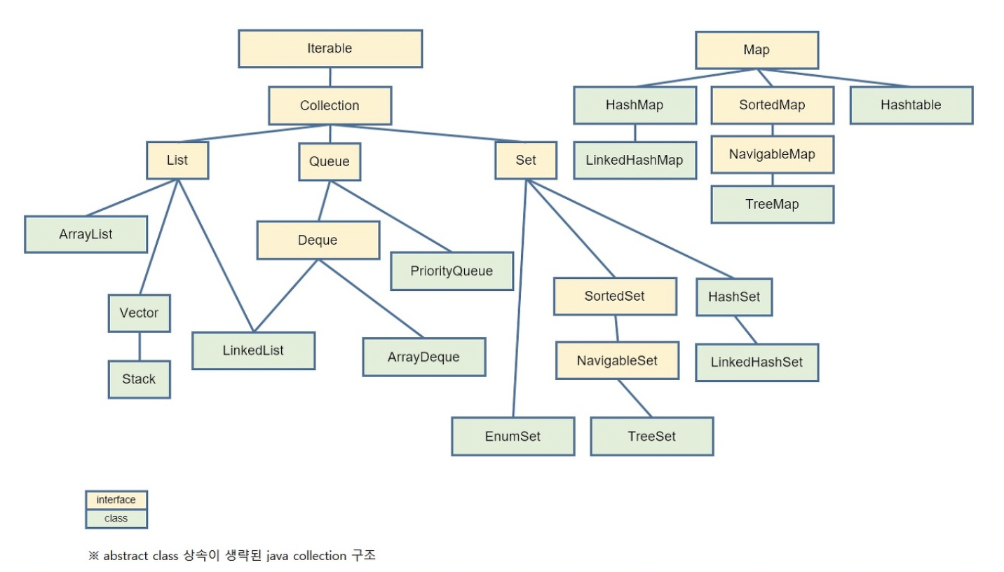 - ArrayList, LinkedList 의 구현체이다. 물론 Vector, Stack은 지금은 사용하지않고 호환성을 위해 남아있는 Class 이다.