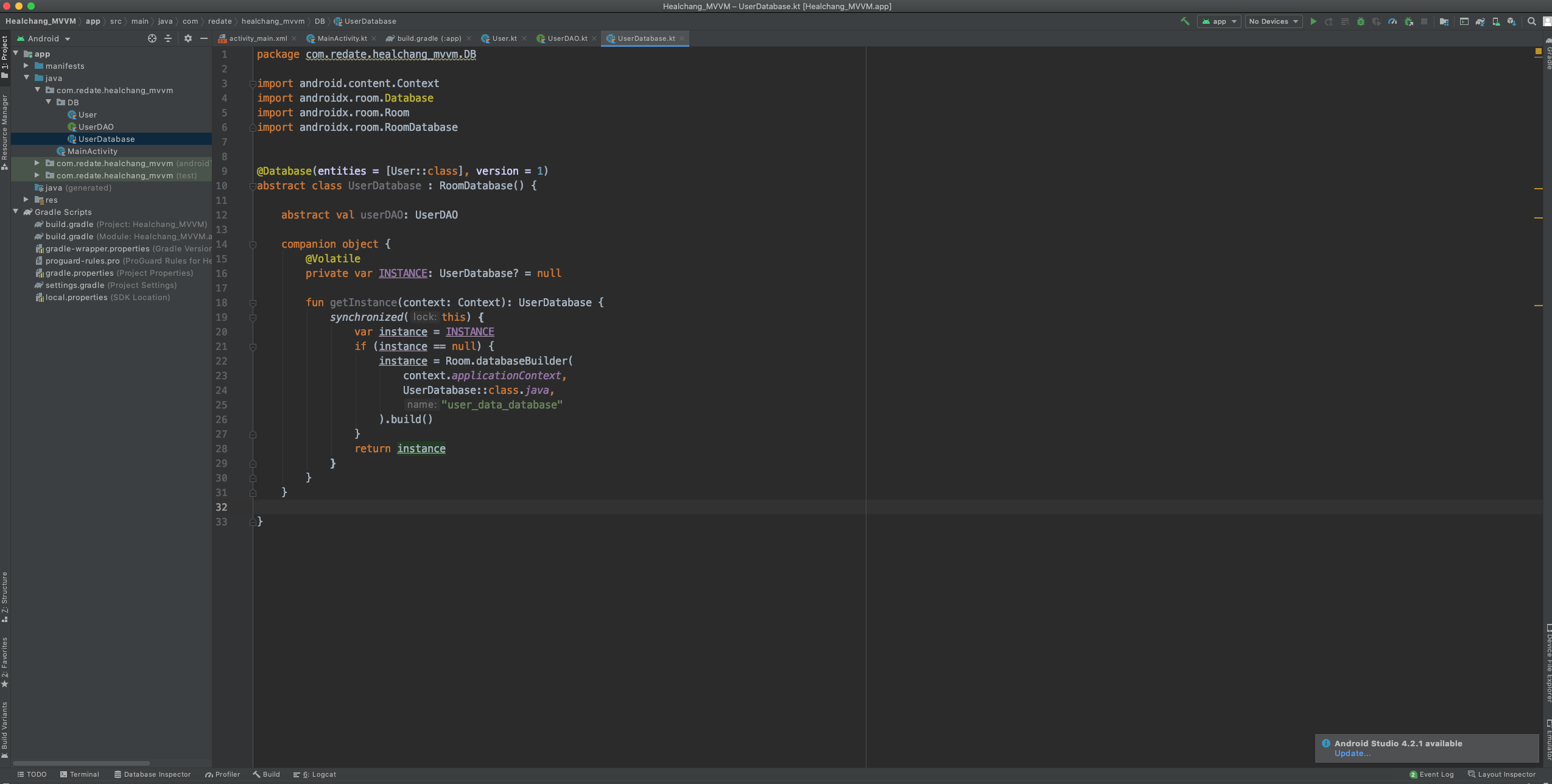 5.1 DB 패키지에 UserDatabase.kt 클래스를 생성합니다.