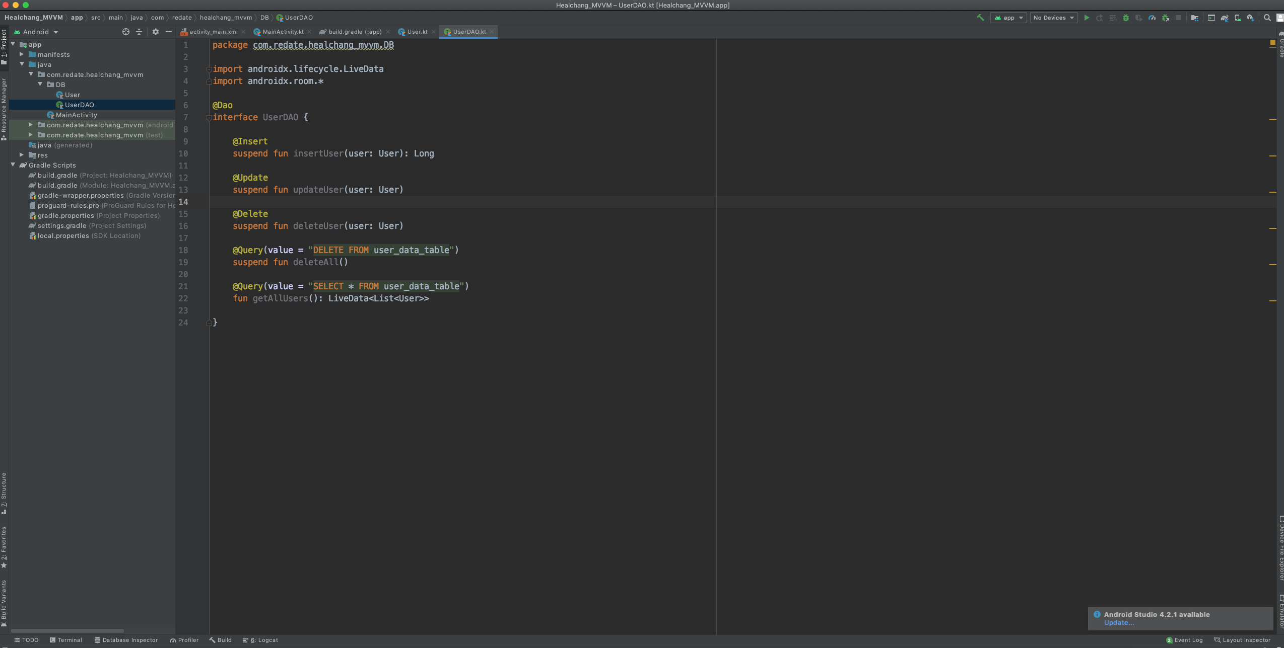 4.1 DB 패키지에 UserDAO.kt 인터페이스를 생성합니다.