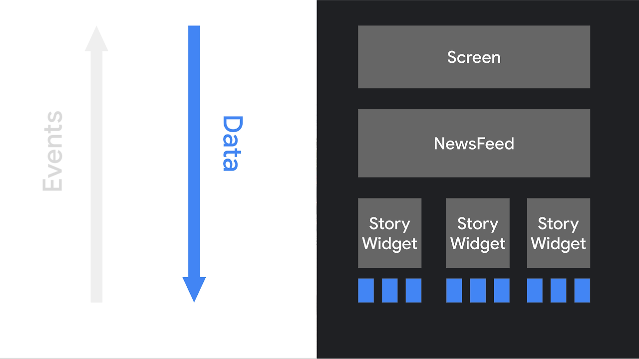 위 그림은 앱 로직은 최상위 컴포저블 함수에 데이터를 제공합니다. 이 함수는 데이터를 사용하여 다른 컴포저블을 호출하여 UI를 설명하고, 해당 컴포저블에 적절한 데이터를 전달하고 계층 구조를 따라 내려갑니다.